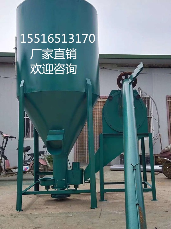 本饲料混合机为单轴,有套管,锥部卸料的立式混合机。工作时将计量好的各种粉状物料依次倒入料斗,由垂直绞龙将饲料垂直向上运送,到绞龙端部由拨料板将饲料抛扬向筒体内壁,物料与筒壁受一次撞击后反弹和散落在桶内。这样循环多次进行混合。