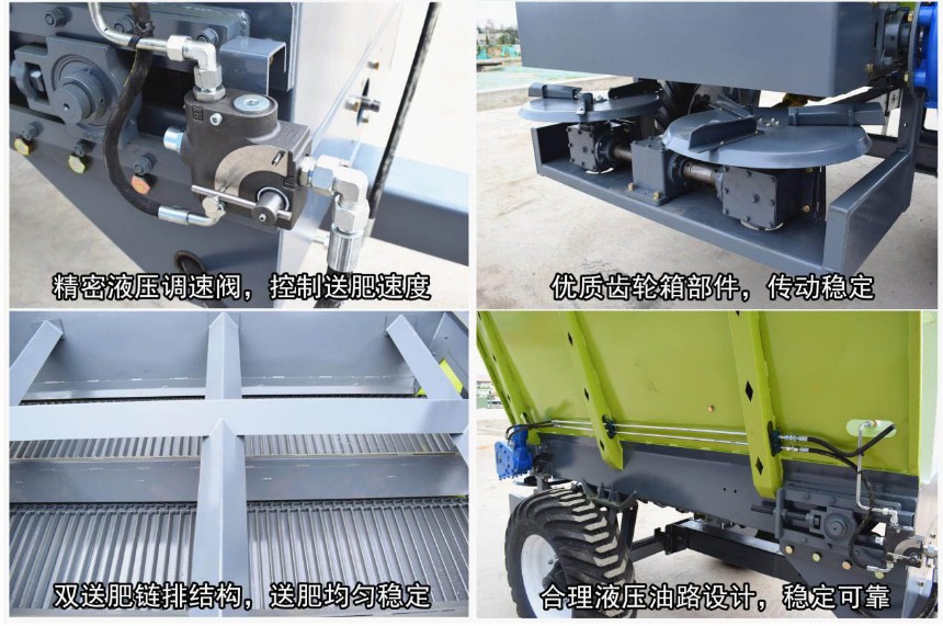 液压驱动送肥链排,通过安装于机身左前方的液压流量调速阀,控制链条输送速度,从而调节抛肥量。