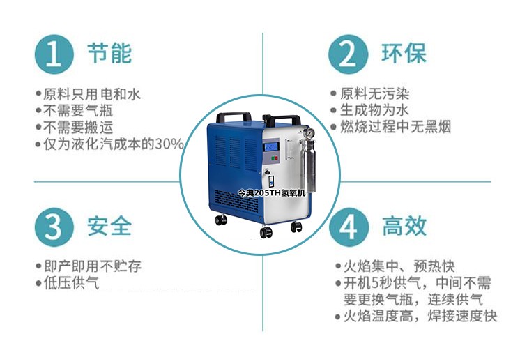 今典氢氧机所需的燃气是边产边用的,不用就不产的,即按需制造、用多少产多少,没有贮存气体,因而避免了高压气瓶的爆炸危险。内置了多道安全防回火装置,即使用户操作失误,因为没有贮存气体,且有阻火装置,所以不会出现爆炸。氢氧焰温度高达2800度,火焰集中,无辐射,因而能实现快速、精准的火焰加工。氢氧焰是一种无碳火焰,不会对工件产生二次污染。