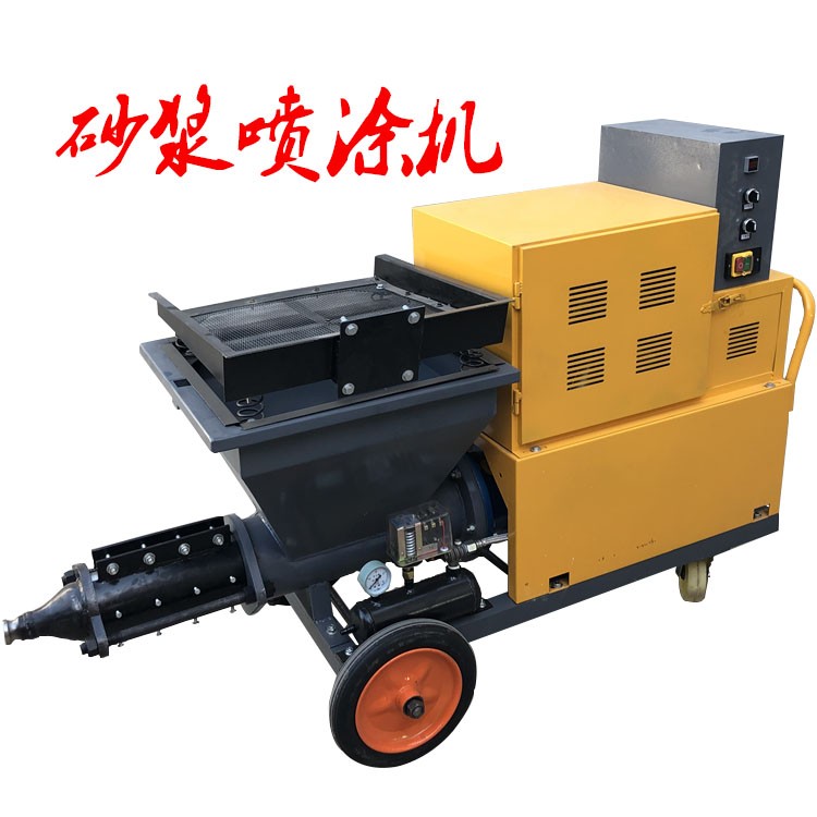 水泥砂浆喷涂机节能。冲洗过的管道必须再次进行润管操作,否则很容易再次产生堵管,因冲洗过的管道会残存部分水分和砂,砂浆遇水易致离析,从而降低了砂浆的流动性而产生堵管。砂浆输送设备产生堵管时应立即停机,先松开水平与垂直管道连接的接口,可以尝试再次启动输送设备,水平管内轻微的堵管都可以通过再次启动机器进行排除。一般情况下堵管都在弯头或垂直位置处,垂直位置的堵管只能用水冲洗管道进行排除,选择合适的软管进行冲洗处理,应从下往上进行冲洗,垂直距离过高时,还应卸开中间部分管道进行处理,中间管道拆卸时应注意安全。冲洗完成后重新装回管道,再次开始输送砂浆前应进行润管处理。另外以下情况也会造成堵管,需要注意:砂浆颗粒太大堵喷嘴、堵喷头致堵管。