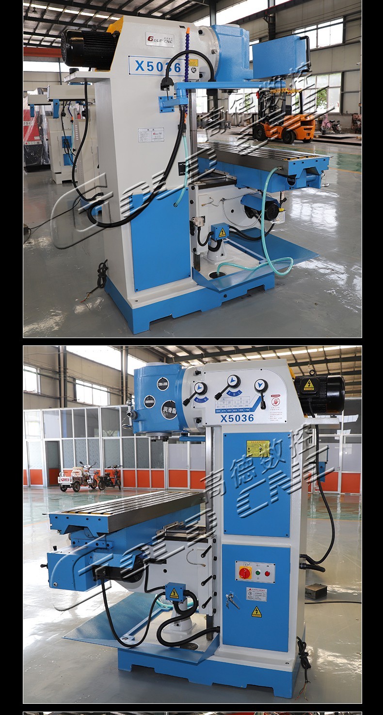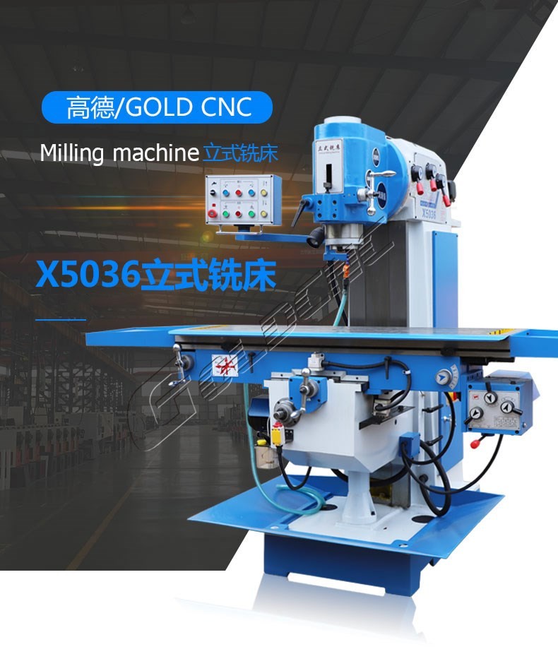 X5036立式铣床是一种通用金属切削机床。本铣床的主轴锥孔可直接或通过附件安装圆柱铣刀、成型铣刀、端面铣刀、角度铣刀等刀具,适用于加工部件的平面、斜面、沟槽、孔等,是机械制造、模具、仪器、仪表、汽车、摩托车等行业的理想加工设备。
