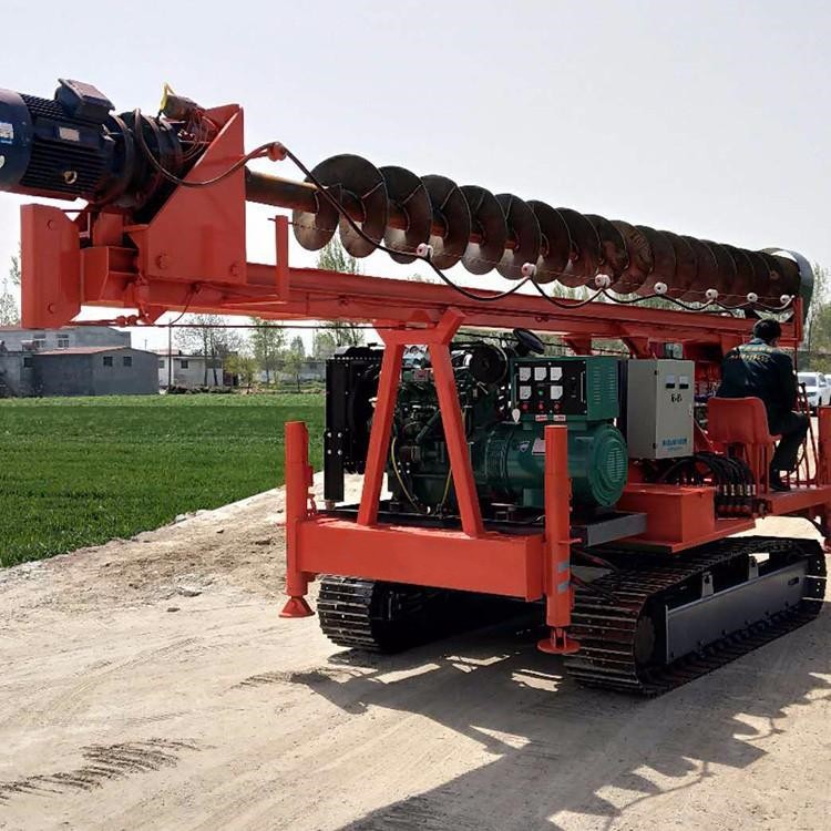 液压打桩机和螺旋打桩机都属于履带式液压打桩机也叫作光伏打桩机,主要是以履带链轨作为底盘,柴油机作为动力也有部分是柴油发电机组作为动力,钻机通过也有传动,带动液压马达以及动力头进行打孔作业,强大的发动机保证了设备拥有足够的扭力。