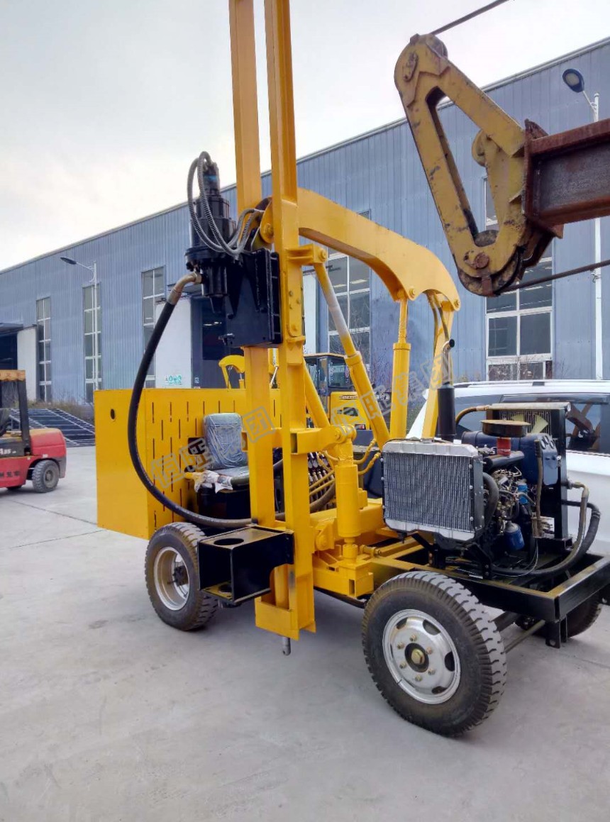 护栏打桩机是我公司根据公路护栏打桩市场的需要,专门设计的一种新型的全液压公路打桩机。该公路打桩机结构紧凑、能满足多种打桩要求、作业范围广、能耗低、打桩效率高、操作舒适、轻便灵活、使用成本低。履带护栏打桩机基于液压系统,履带底盘用于工地行驶。爬坡抓地能力强.在崎岖山路工作有效保护施工者安全。