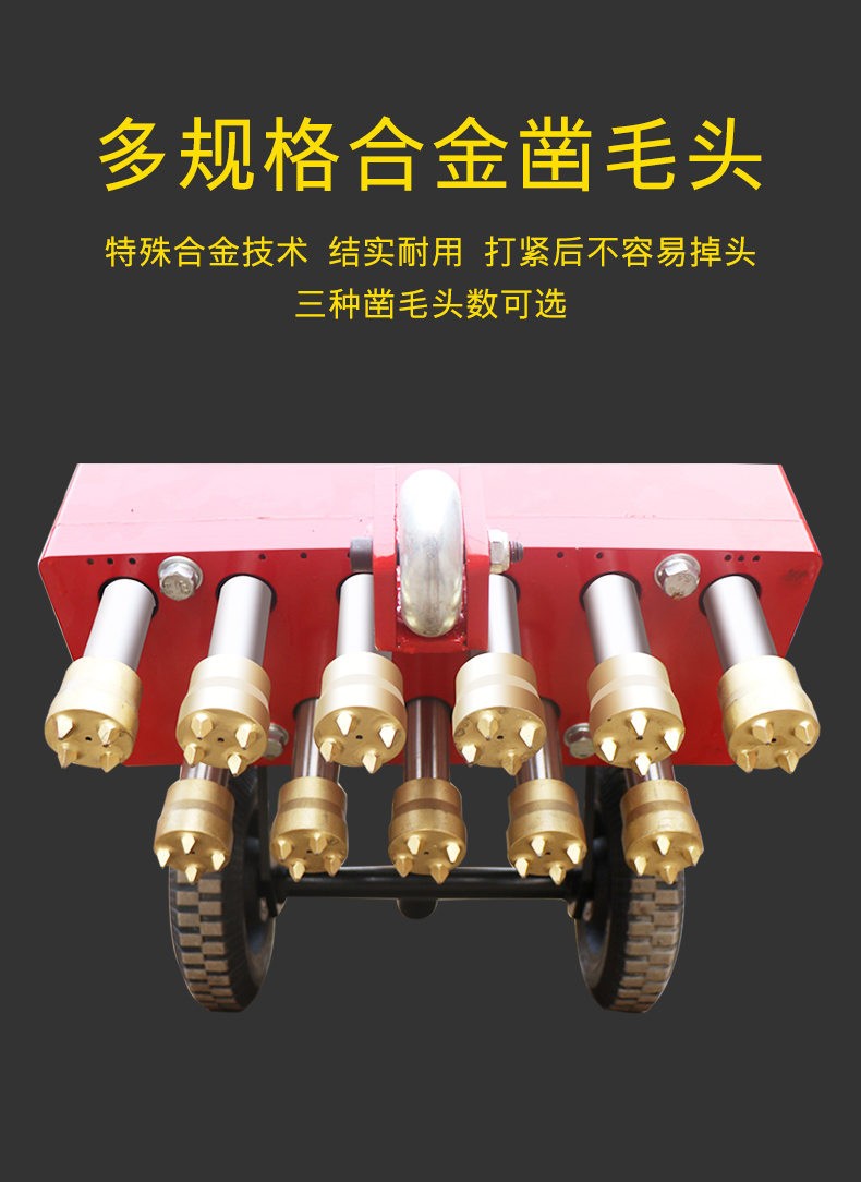 手持式凿毛机,机型小,机身轻便,每分钟每个凿头做2500次的凿击频率,每小时凿击面积按不同混凝土强度及凿深要求的不同可完成约3-10平方米,同时减少对基础的破坏。机器动力由0.7m3/5公斤压力的空气压缩机来进行操作。其凿毛头是高优质钨钢合金凿头,硬度强,高击打质量。