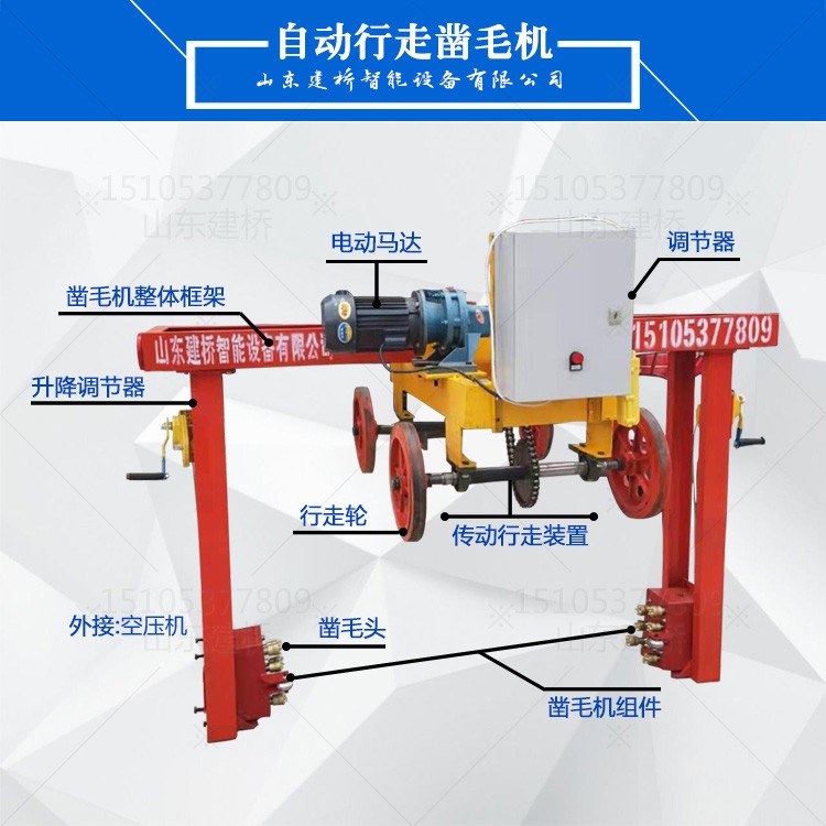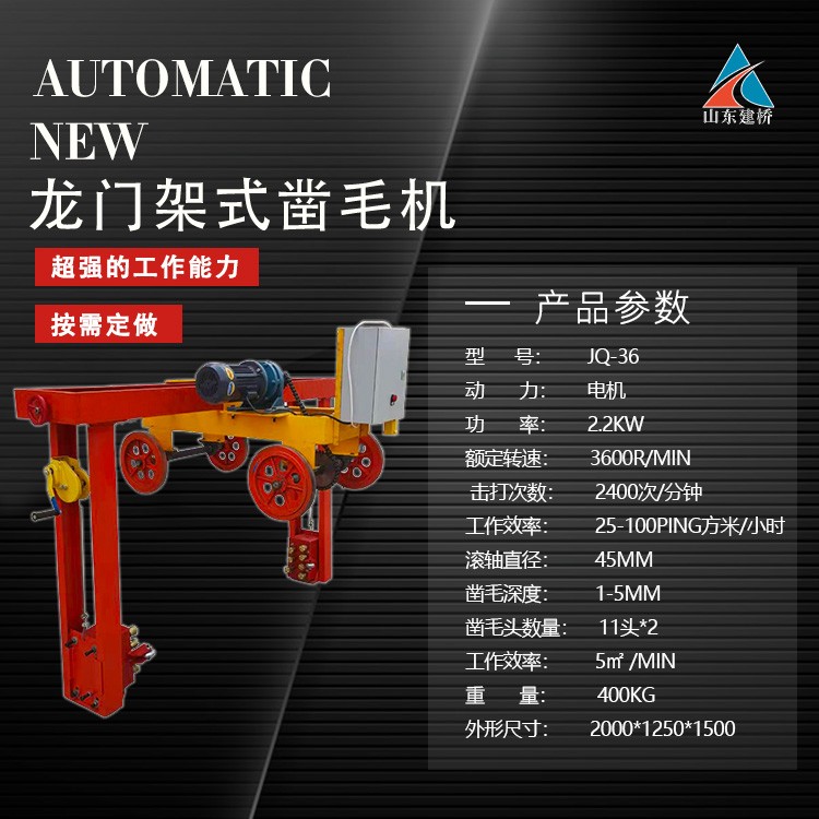 产品特点:机型小操作灵活,凿毛头是钨钢合金制作,使用寿命在8000m2以上,凿击打频率在每分钟2400次,每小时凿击面积根据不同的混凝土强度可达25-100M2,对基础主体不构成破坏,具有chao强的工作能力,根据箱梁立面高度不同具有可以升降调节功能。