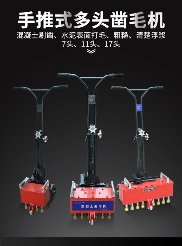 手推式地面行走凿毛机,机型小,操作灵活,其凿毛头是高优质钨钢合金制作的,使用寿命在3000m2以上,每小时凿击面积按不同混凝土强度可达30-100平方米,对基础主体不构成破坏,具有超强工作能力。荣成高速公路手持凿毛机产品齐全。