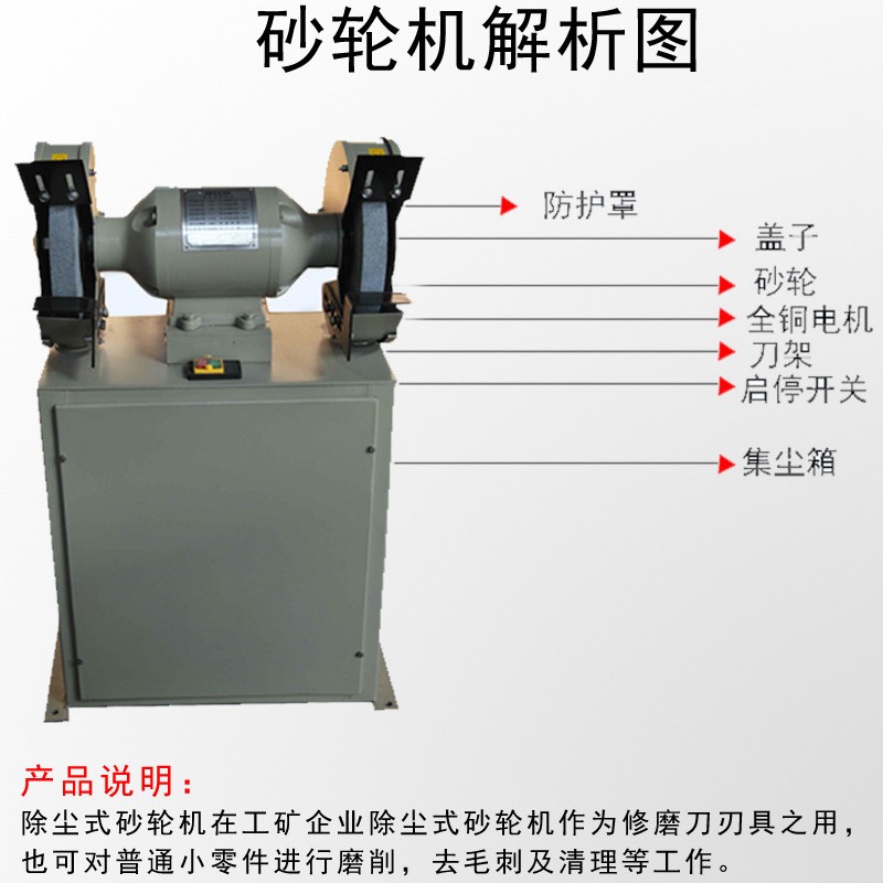 1.除尘式砂轮机主要供一般工矿企业作为修磨刀刃具之用,也可对普通小零件进行磨削,去毛刺及清理等工作。