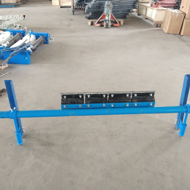 H型合金橡胶清扫器安装于头部卸料滚筒处,清除输送带上的粘附物件,完成一次清扫。