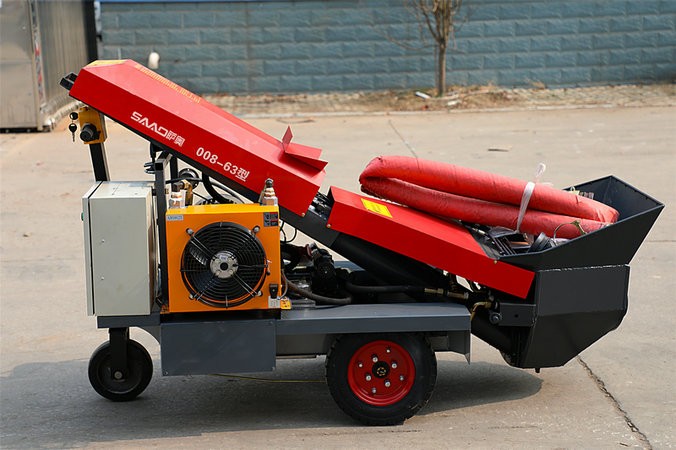 4、各部位检查完毕后,机器料斗先放入一小车灰浆,开动机器待灰浆进入输送管道1-2米后,(灰浆是用来润滑管道,防止管道堵塞)随后放入细石混凝土操作即可.