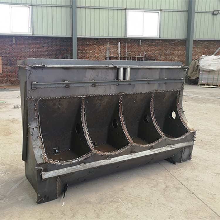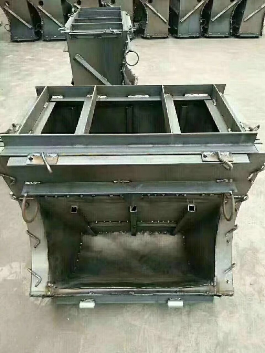 大三孔水泥料槽模具外型尺寸:900*720*450,是用的最多的一种。用加厚型钢板制作而成,重约80KG,成品水泥料槽可达342斤重,