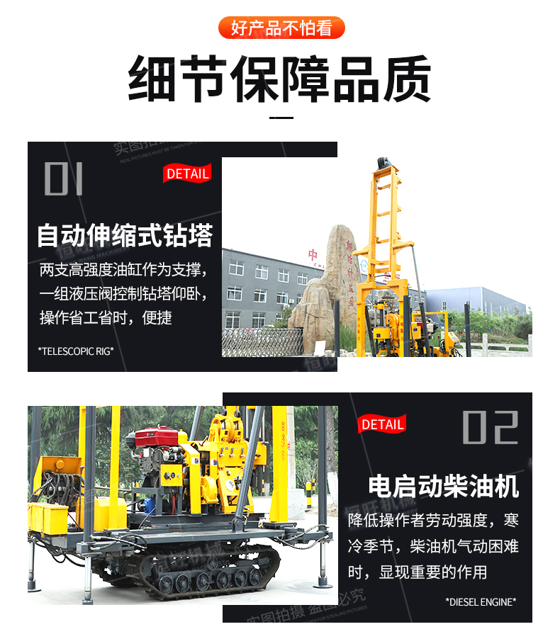1、钻机采用自动伸缩式钻塔,用两支高强度油缸作支撑,一组液压阀控制钻塔仰卧,操作省时省力,大限度的为用户创造效益。