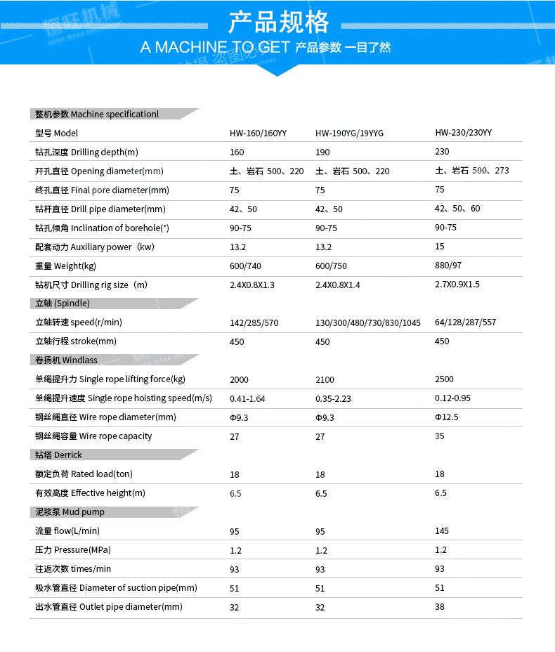 五档变速,高转速1045r/min,钻进效率高, 采用53?59六方主动钻杆,刚性强,传递扭矩大, 卷扬机行星齿轮加大模数并加装支撑架,大大提高卷扬机提升及制动能力,立轴箱四组轴承定位,确保回转器有足够刚性应对碎石层,卵石层等复杂地质条件,配备流量达160L/min的一体式泥浆泵,具有节省成本,结构紧凑,移动轻便的特点。
