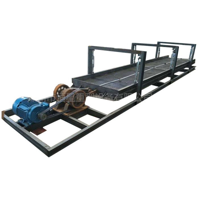 电机带动偏心轴旋转,通过拉杆将偏心轴的旋转运动转变为筛体的往复直线运动,再利用物料的自重作用及筛体的安装倾角,使物料由细到粗依次从筛网孔中卸出,从而达到筛分物料的目的。