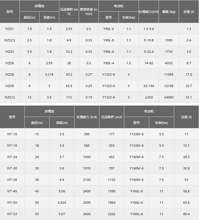 浓密机主要由圆形浓缩池和耙式刮板机两部分组成。浓缩池里悬浮于矿浆中的固体颗粒在重力作用下沉降,上部则成为澄清水,使固液得以分离。沉积于浓缩池底部的矿泥由耙式刮板连续地刮集到池底排矿口排出,而澄清水则由浓缩池上沿溢出。