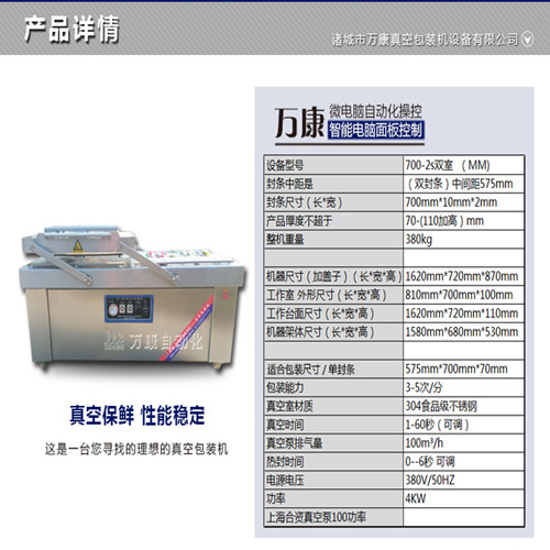鸡爪真空包装机是包装机的一种,利用其真空室对包装进行抽空,然后再充入惰性气体以达到防腐保质的目的。全自动双室真空包装机专为包装含水量大的产品而设计,采用日本控制线路,吸取国外同行业的技术经验,其电器方面采用微电脑控制器全程控制,它具有防水、防潮、故障率低、使用寿命长等优点,这些优点使该设备便于清洗,就算用水直接冲洗也不会发生任何电器故障,架体采用食品用304不锈钢板,强度高,不易破损,它的倾斜台面设计,可以保证产品内的水份不流失,从而使产品的含水真空包装更易操作。