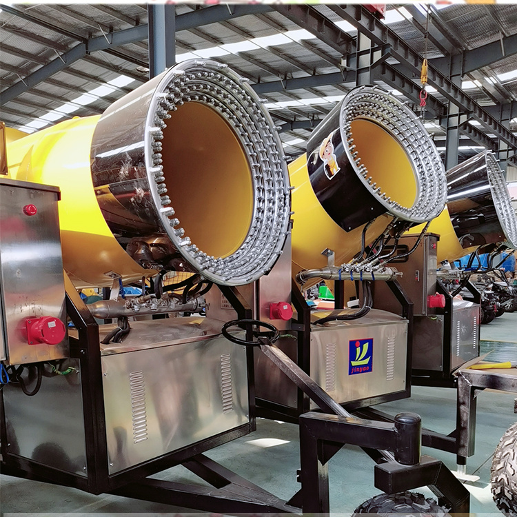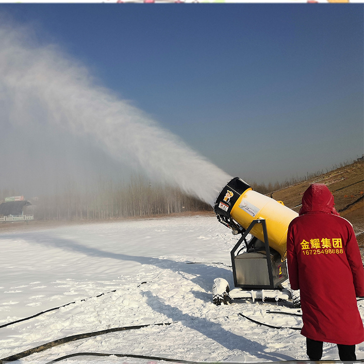 ??造雪机在零度以下,湿度60 以下出雪,每小时的造雪量为30-90立方米,理想状态下1立方水可以造2.5立方雪。