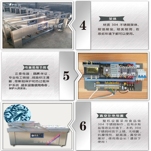 万康双室真空包装机,只需按下真空室盖即可自动完成抽真空,封口,印字,冷却,排气等全过程。经真空包装后的物品可防止氧化,毒变,虫蛀,受潮,延长产品的储存期限。本公司出品的真空包装机都配备油污硬物颗粒过滤系统,控制系统都采用进口原件使用寿命长操作简易,真空室空间设计达到抽气速度快使用寿命长,采用不锈钢制造(可根据客户需求定制304或316#不锈钢材料、配置德国真空泵),平板型真空包装机适合生产包装的物品如卤制品蛋、鸡翅、肉、蔬菜、豆制品五谷杂粮酱料包酸菜等多种物品的真空包装机。