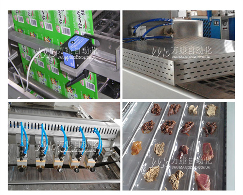 2、 真空封口部分:采用4轴杠杆垂直独立升降系统,带有自锁功能,升降平稳,轴承使用德国易格斯直线轴承,升降平稳,无噪音,免润滑,封口加压系统采用8个台湾亚德客大缸径气缸封口,封口系统采用双轴定位,保证加热板垂直封口,封口平整,压力大花纹清晰,封口效果好,减少热能损耗。