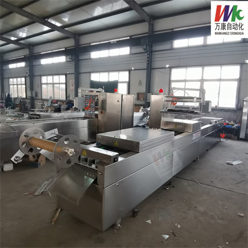 狮子头扣肉拉伸膜真空包装机构造1、 成型部分:采用4轴杠杆垂直独立升降系统,带有自锁功能,升降平稳,轴承使用德国易格斯产直线轴承,升降平稳,无噪音,免润滑,加热板采用凹凸设置成型无横筋褶皱,成型方式采用德国原装进口BUSCH063真空泵加负压储气罐抽气系统,高速预热快速成型,自带水循环定型冷却系统,拉伸均匀到位,提高片膜阻隔性,厚度比传统成型方式提高百分之30。