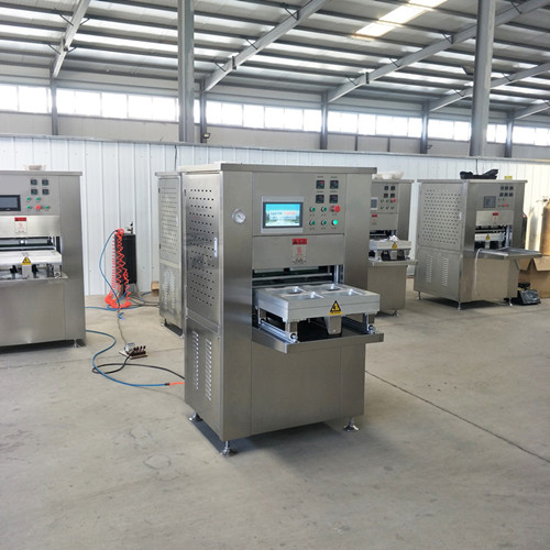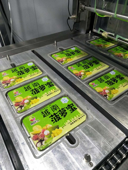 2、将已填充物品的包装盒放入下模腔后包装过程自动完成:抽真空、充气-热压封口-分切-包装成品排出。
