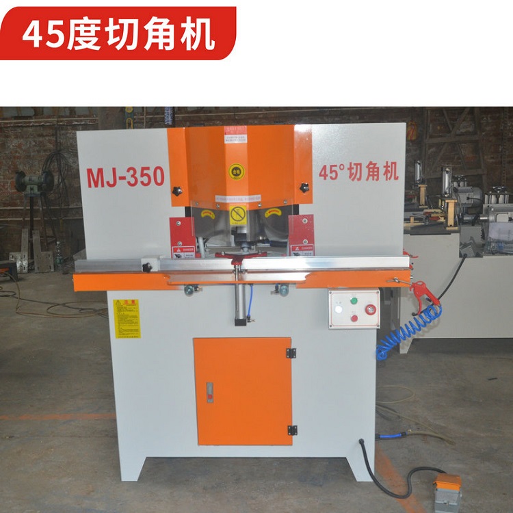 MJ355双头切角机主轴高速运转,同时锯切两个45度角.锯切角度准,材料切割面平滑无刺,无需二次加工.适合于推开门窗框、铝相框、镜框、展示柜、空调出风口、灯箱、屏风、饰条、铝封边条、橱柜、灯具、画框等进行45度切角。操作方便简单,工作效率快,切割角度准,省人工,操作方便.是铝材、木材45度斜角加工的设备。