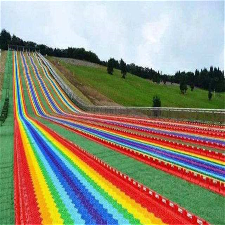彩虹滑道长度以及宽度是可以定制的,是按照每平米多少钱收费的,滑道可分为单人滑道、双人滑道、多人滑道,常规的滑道长度为30-300米,可加根据场地坡度加入滚珠数量,提升速度,(不破坏原先基础,环保,提倡),场地无滑坡也可用钢架、脚手架搭建,可组合不同图案,如彩虹色、滑草绿等图案。
