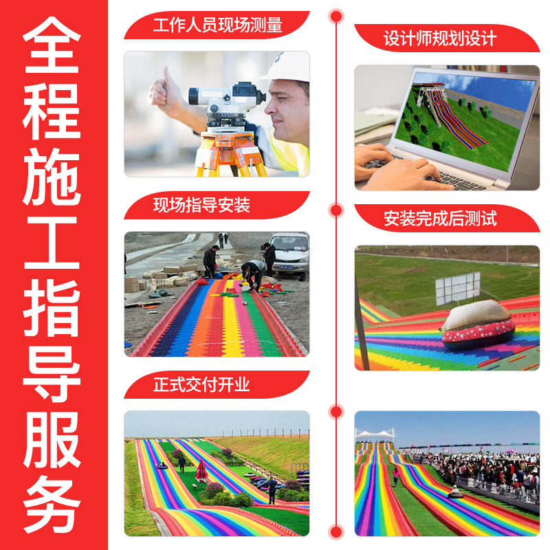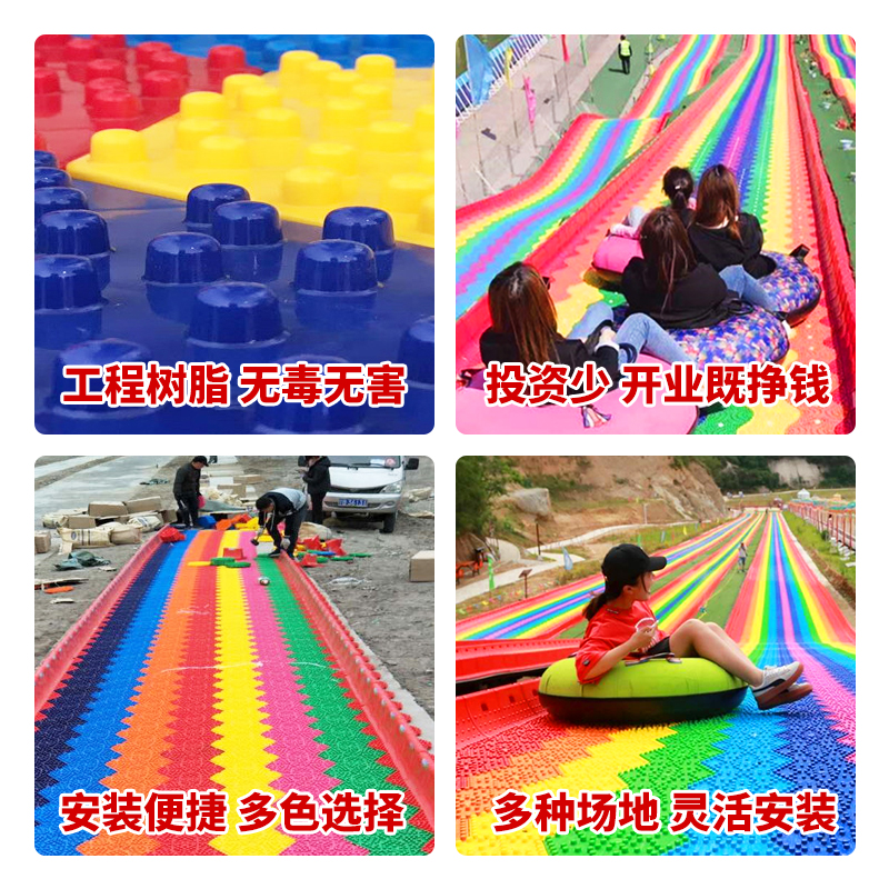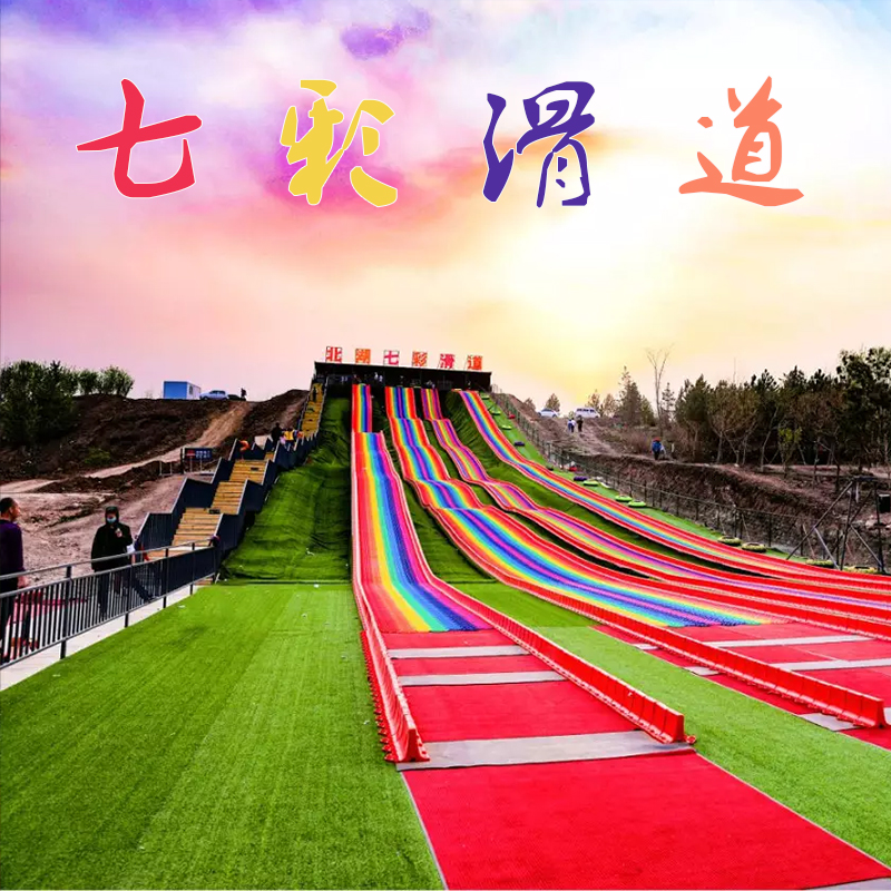更加吸引游客,彩虹七彩滑道具有施工方便,旱雪板润滑性好,颜色随意拼接七彩旱雪滑道在建造的时候可以根据长度组合着添加几个波浪造型,让整个行进的过过程中不止有前行,倒滑还有上坡、下坡、旋转的多种感受。