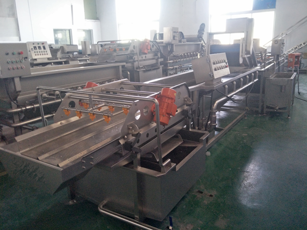 预制菜生产线清洗机主要用于水果、绿叶蔬菜、菌类、海产品的清洗,可分阶段清洗,分别去除泥沙、杂物、漂洗等。去杂洗净度高,能保持原有色泽,气泡清洗机是草莓、大枣、苹果等水果,蔬菜水产生产线中的重要组成部分。气泡清洗机的原理主要是利用箱体前部分设备箱体中注适量的水,原料在经过箱体时,会与气泡机和水结合作用下做翻滚状态,并随网带不断向前推进,在出水面时,高端设有喷淋头,高压冲洗。