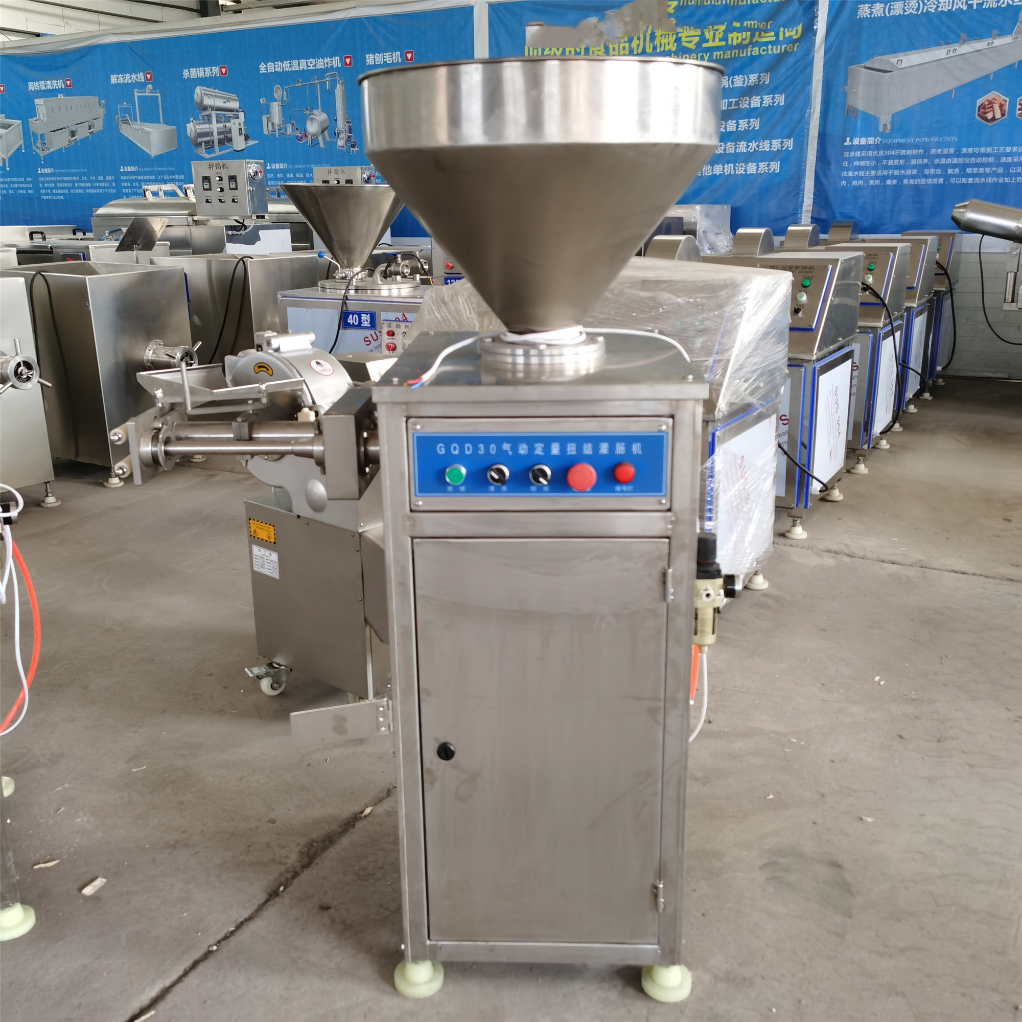 气动定量扭结灌肠机采用先进技术运用气动、光电控制原理,可连续自动定量灌装扭结,适合灌装各种、火腿类产品,适合天然肠衣、胶原、烟熏肠衣。此机体积小,投入低,适用于中、小型肉制品加工企业。改变了以往灌肠机只灌肠,不能自动扭结的现状。