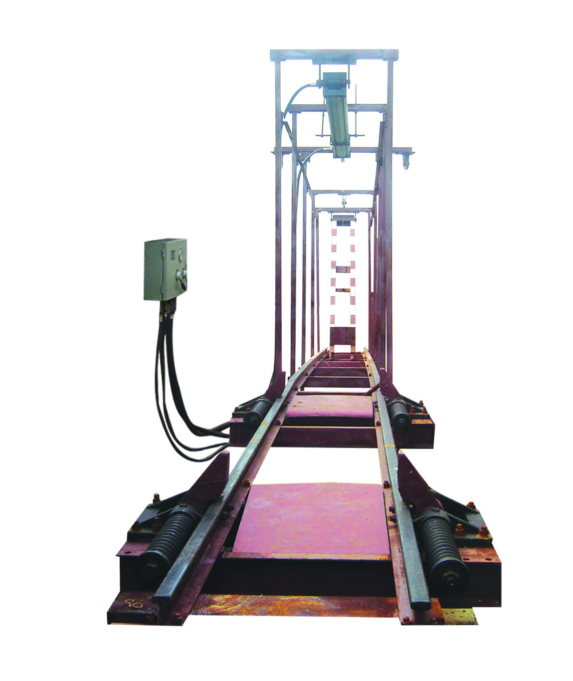 QZCL-240气动挡车梁主要由气缸、挡车梁、气控箱等部分构成,气动挡车梁为常闭型挡车装置,当有矿车通过时,操纵换向阀,使气缸活塞杆收缩,通过钢丝绳拉动挡车梁升起,矿车通过后操纵手动换向阀,压缩空气经管路进入气缸的工作腔使活塞杆伸出,挡车梁在自重作用下回落至挡车梁的关闭挡车位置。