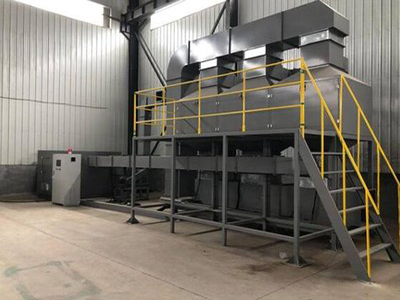 废气催化燃烧设备为防止活性炭堵塞,废气进入设备前需增设干式过滤器进行预处理,把废气中的杂质及颗粒物进行过滤,确保活性炭的使用寿命。脱附后的气体经阻火器、进气阀、换热器、电加热器(预热器)升温,使气体温度升至催化燃烧所需要的温度,在催化床内的催化剂的作用下分解成水和二氧化。