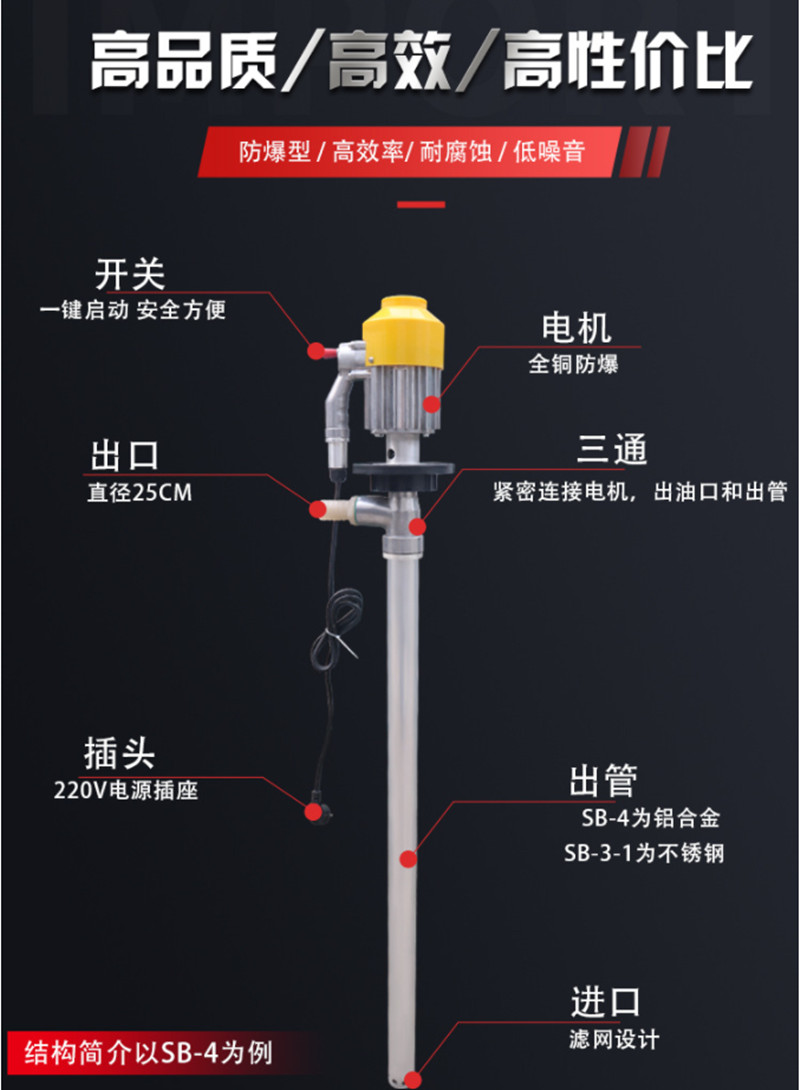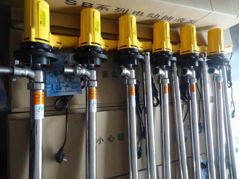 电动抽液泵可以直接插入物料桶(适用于符合GB/325—1991标准的钢桶、塑料桶及多种规格小桶)中,抽取桶内液体