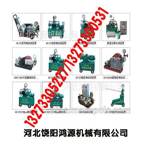 我厂各种试压泵:生产阀门压力测试试压泵,3DSY-S70电动试压泵,3D-SY大流量电动试压泵,3D-SY750电动试压泵,管材专用试压泵,4D-SY200/3型电动试压泵,4D-SY/3.5型电动试压泵,4D-SY压力遥控自控电动试压泵,4D-SY型电动试压泵,4D-SB电动试压泵,2D-SY高压电动试压泵,2D-SY型电动试压泵,DSY-6型电动试压泵手动试压泵,计算机试压泵,C3D-SYB柴油机试压泵,400MPa超高压电动试压泵,200MPa超高压电动试压泵QST气动试压泵,气动试压泵(含无纸记录仪),QY-140J气动试压泵带记录仪,单缸便携式气动试压泵,变频变流量试压系统,流量可调式试压泵,数显式记录仪试压泵,计算机控制试压泵气液综合测试系统,计算机控制大流量液晶数控试压系统,液晶数控试压泵,2S-SY双缸手动试压泵。电动试压泵属于往复式柱塞泵,电机驱动柱塞,带动滑块运动进而将水注入被试压物体,使压力逐渐上升。该机由泵体、开关、压力表、水箱、电机等组成。