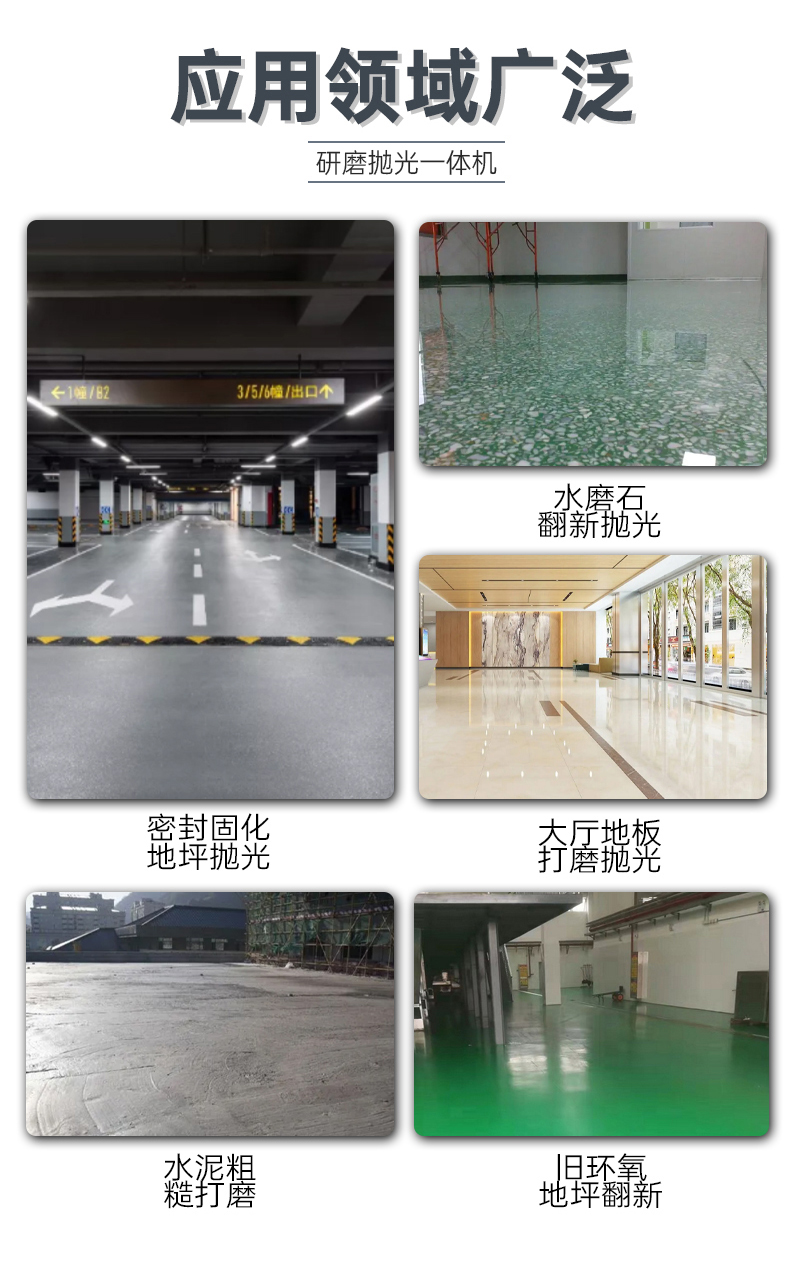 可千湿两用。适合各种天然、人造石材地面:环氧地坪~水泥地坪、环氧水磨石、环氧金刚砂地坪、固化剂地坪、ovc地坪的整平、磨拋,清渣,清洗等各种施工工艺需求。地坪研磨机主要应用于水泥地面、水磨石地面、骨料、花岗岩等的找平、打磨、抛光等。、环氧中间层的打磨;平整粗糙表面或镘刀痕迹。涂抹表面的处理、去除表面粘结物和涂装缺陷。去除砂浆表面的瑕疵,平整高起的斑块。去除地坪表面的油漆、聚氨酯、环氧树脂等。对硬化地坪的清洁、打蜡、抛光处理