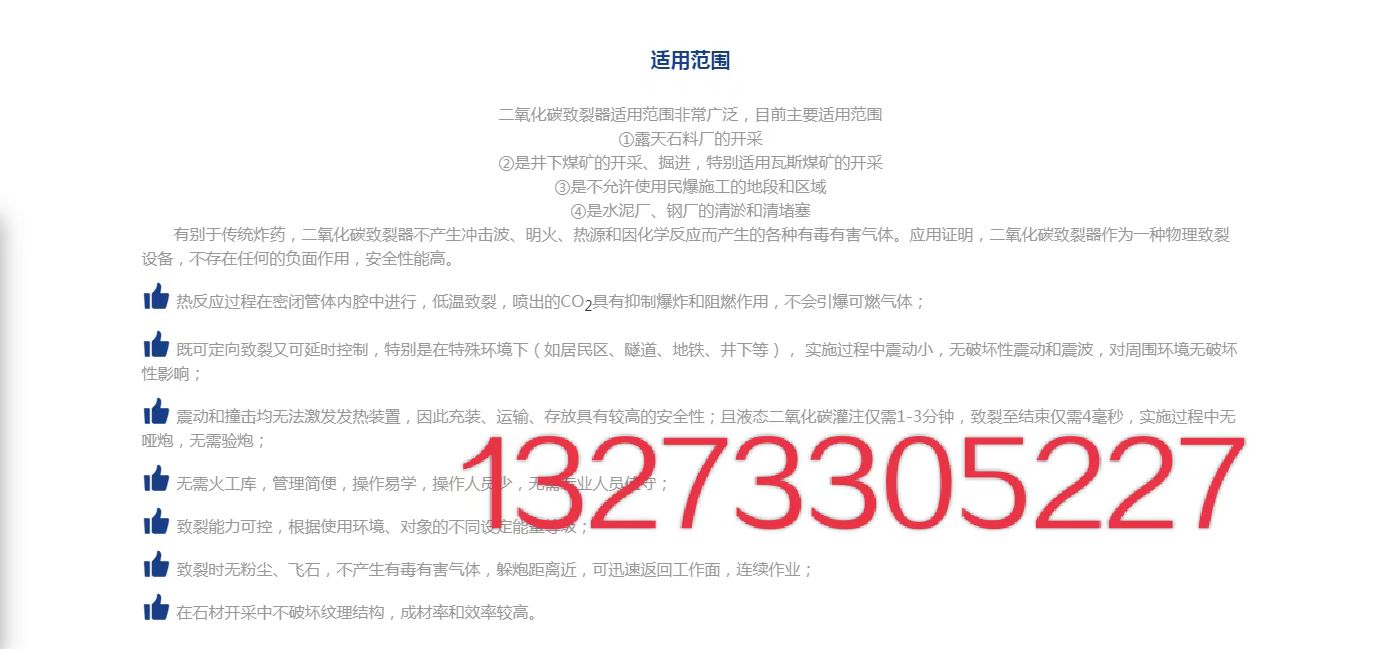 CO2在低于31摄氏度或压力大于7.35MPa时以液态存在,而超过31摄氏度时开始气化,且随温度的变化压力也不断变化。利用这一特点,在致裂器主管内充装液态CO2,使用致裂器快速激发加热装置,液态CO2瞬间气化膨胀并产生高压,体积膨胀600-800倍以上,当压力达到极限强度时,高压气体冲破释放并作用在岩体、矿体上,从而达到膨胀致裂的目的;克服了以往用炸 药致裂开采、预裂中破坏性大及危险性高等缺点,为矿山及岩石的安全开采和预裂提供可靠保证,可广泛应用于矿山、水泥、采石等诸多行业。同时,CO2致裂器致裂过程中快速释放的CO2气体具有降温作用,CO2又是惰性气体,完全可以避免因放炮产生明火导致的相关事故。