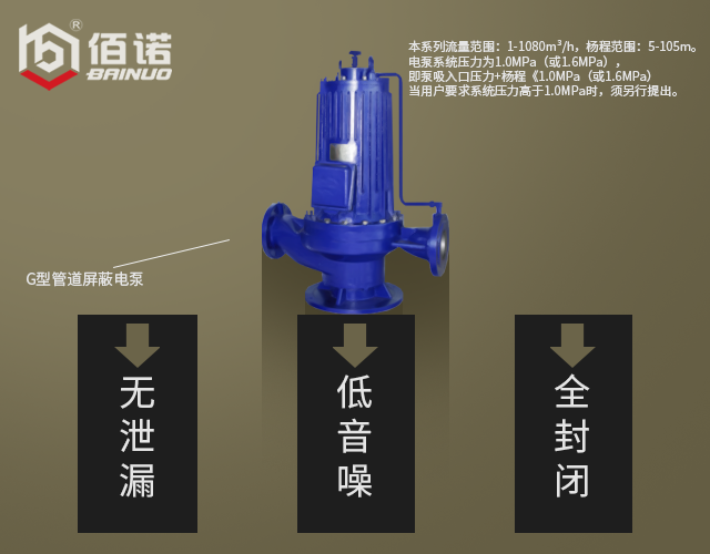 G系列低噪音管道屏蔽电泵采用全封闭、无机械密封的新型结构。定转子采用不锈钢套分别屏蔽密封,输送液体可进入电机内部冷却,从而解决了普通管道电泵因使用机械密封而导致输送介质泄漏、污染环境、运行可靠性差、维护困难等问题。转动部分则采用石磨轴承支承、输送介质润滑,是低噪音绿色环保型升级换代产品。由于其低噪音、无泄漏、运行可靠、免维护等优点深得用户信赖。 G系列屏蔽电泵主要用于暖通空调冷热水循环,工业、城市建筑给水,消防管道增压,远距离输水等场合。