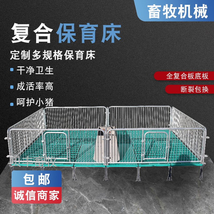 小猪保育床是专为断奶后的小猪设计的,给离开大猪的小猪提供了便利舒适的环境。节约占地,增加单位饲养头数,便于饲养管理,粪便清理,降低人工劳动力,仔猪断奶后养殖所需要的栏具。四周围栏,底部铺有塑料漏粪板(方便粪便清理 保证地面干燥 减少细菌滋生),在底部有扁钢支撑。配有双面料槽,床底与床架以螺栓连接拼装,每栏片用插销连接,方便组装。