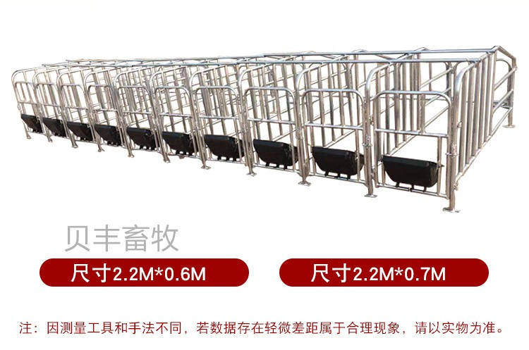 母猪定位栏养猪设备是专为母猪或育肥猪定制的。厂家直销,免去中间所有费用。整套母猪定位栏的尺寸是2100*6500,十个位一组。或者可以根据客户猪舍面积,定制一组的尺寸。十个位一组是11片大架,10对前后门。带十个加厚的钢板食槽。直接用膨胀螺丝固定到地面上即可。有的客户要求是带复合板1100*600.十块半漏复合板,十块条缝复合板,33个腿,9个四眼腿+22个两眼腿。