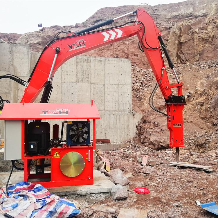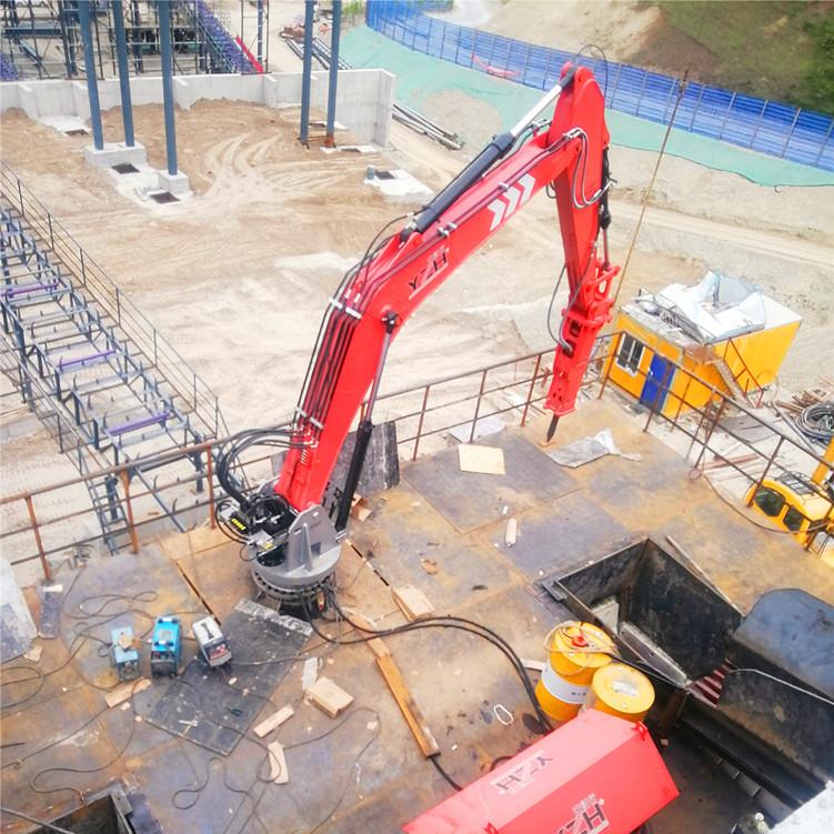 固定式机械臂的属具可更换为液压钳、挖斗、莲花抓等,可实现挖掘、抓取、压碎、转运等其他功能,使固定式液压机械破碎臂具有更多功能。