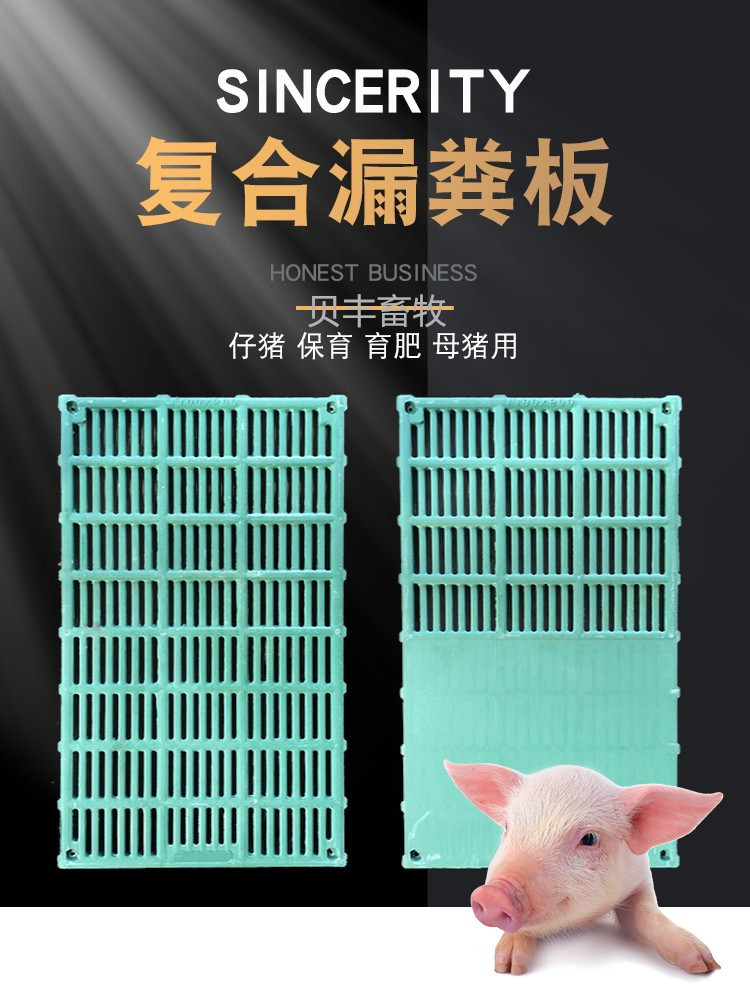 复合漏粪板是以不饱和树脂等为基体、轻质碳酸钙为填料,玻璃纤维增强,并添加多种添加剂及颜料等均匀混合而成的新型合成材料,经350吨及500吨压机机压成型,由于配方合理,工艺,易于成型及成型收缩率低,尺寸精度高,加工性能好等特点,使其产品其有良好的电绝缘性、阻燃性和机械强度,保温、散热性能好,可适用于各种消毒工作并且重量轻、平整光滑、不腐蚀、化、不伤脚、不伤奶头、安装方便、且设有防滑层,价格便宜等优点,是未来猪场理想的漏缝地板。