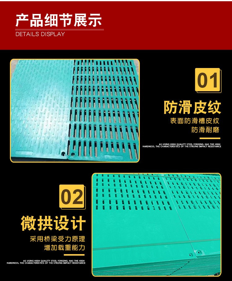 复合材料漏粪板介绍:该产品是以不饱和树脂为主要原料,轻质碳酸钙、玻璃纤维以及添加剂等多种新型合成材料成分均匀混合搅拌,后经800吨压力机经过高温压制而成,由于配方精准,工艺先进,生产出的产品成品率高,已成型表面光滑无毛刺,该产品还有良好的电绝缘性、阻燃性、保温效果好,并且适用于各种消毒工作,该成品平整光滑、耐腐蚀、抗老化、不伤脚、不伤奶头、方便安装、产品表面有防滑层等优点,是未来养殖场长最理想的漏粪地板。