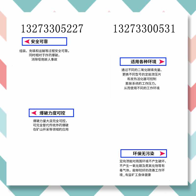 二氧化-碳气体爆-破简介:二氧化-碳气体爆-破又名气体膨胀、静态爆-破等、 此类设备爆-破全程无哑炮,安全可靠,无需向部门申报审批即可施工,对于危险爆-破、金属矿山开采、清污处理、施工不好批复影响工程进度等尤为适合。 设备原理:气体爆-破设备是利用液态(二氧化-碳气体目市场容易购买价格低廉:多选二氧化-碳为爆-破辅材)受热汽化,快速释放高压气体断裂,松动岩石,解决了爆-破开采欲裂中 性大,危险性高,灰尘大等缺点,为矿山开采和松动提供有利