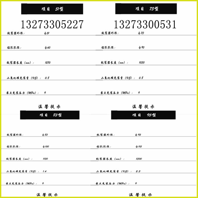 液态二氧化碳致裂器所用的发热材料是由多种化学原料按一定比例混合配置而成,它在空气中具有燃速低、不易燃的特点。由于致裂器采用液态二氧化碳气化体积膨胀原理制成,众所周知二氧化碳具有灭火作用,故此使用液态二氧化碳致裂器不会像药炸那样产生明火、具有非常安全的特性。