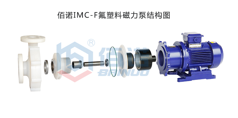 氟塑料磁力泵利用磁力偶合器传递动力,全密封无泄漏,当电动机带动磁力偶合器的外磁钢旋转时,磁力线穿过间隙和隔离套,作用于内磁钢上,使泵转子与电动机同步旋转,无机械接触地传递扭矩。由于液体被封闭在隔离套内,从而解决了物料的泄漏,减少了污染,节约了能源,净化了环境,保护了生产线上工作人员的身心健康。