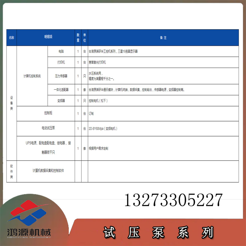 计算机控制机柜、电脑主机、显示器、打印机、UPS电源、适配器、配电盘接触器若干、计算机控制试压爆破软件等。