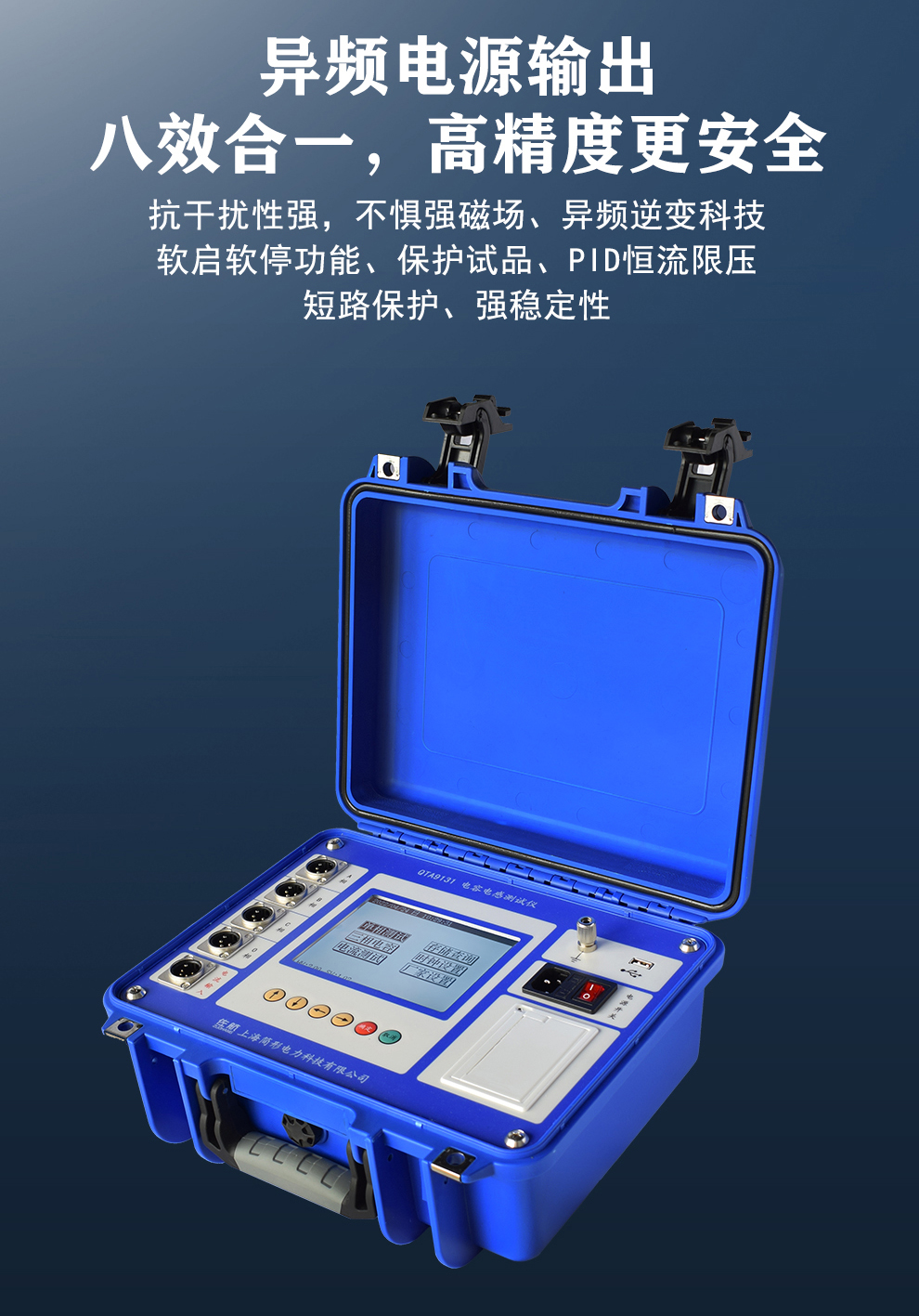 仪器使用异频电源输出进行测试,大大提高了现场的抗干扰能力,可在高强度磁场中进行测试而精度不受影响;异频电源采用先进的逆变技术,具有软启、软停功能,大大减少对试品的冲击,更好的保护试品;同时电源输出采用先进的PID调节算法进行恒流限压输出,更加强了测量的精度和稳定性,同时输出短路也不会损坏仪器。