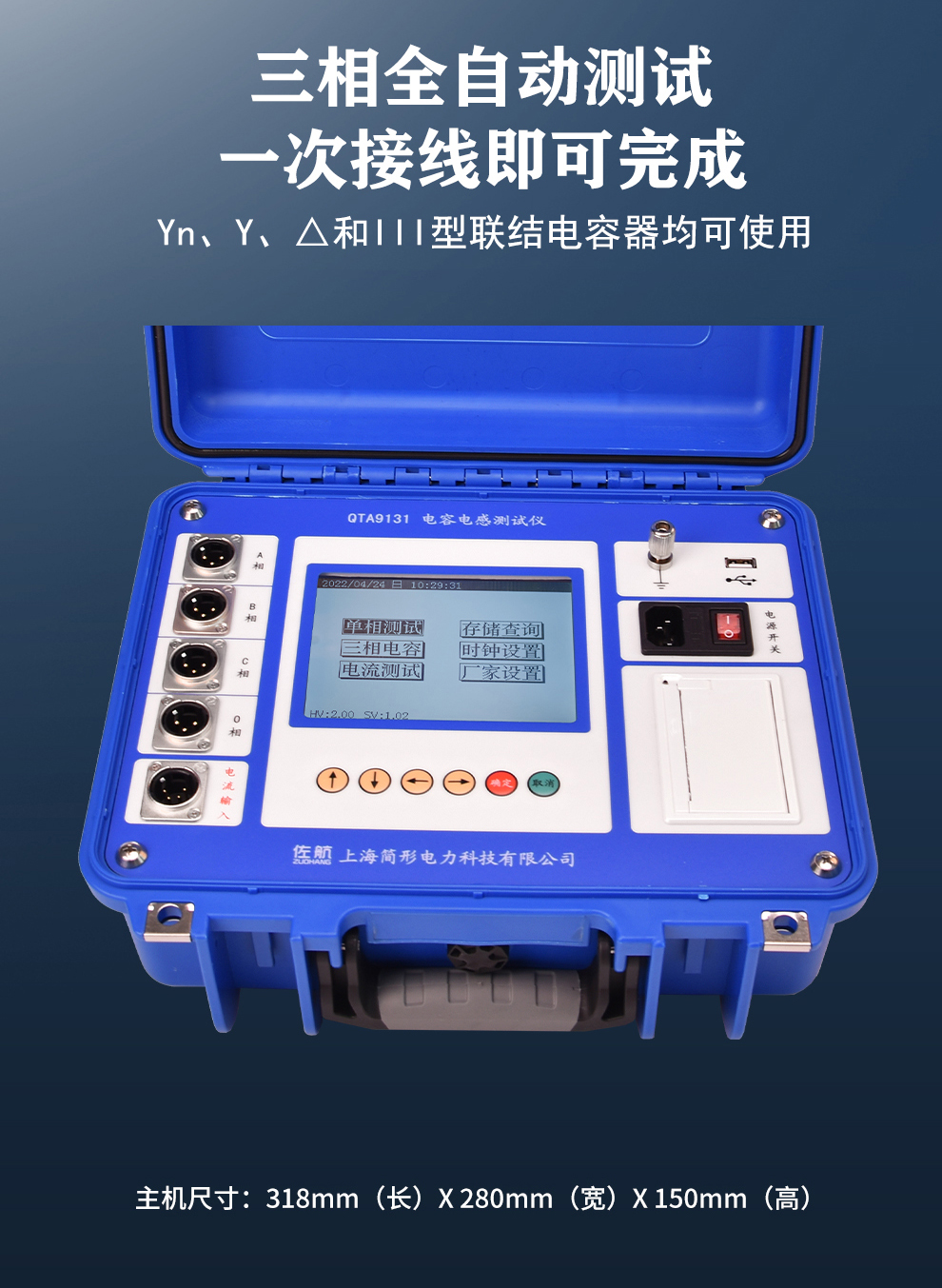 仪器具有三相电源输出及接口,可对三相Y型联结电容器、三相Yn型联结电容器、三相△型联结电容器、三相III型联结电容器进行一次接线,即可完成三相电容测试,并对分相电容分别进行测试计算,简单、方便,大大提高了现场使用人员的工作效率。
