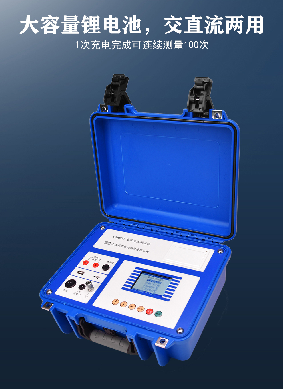 佐航QTA9211电容电流测试仪。采用全新硬件结构和速度更快的ARM处理器及AD转换器,内置全新的全数字变频逆变电源,效率高、发热量小、体积小、重量轻。与前一代相比,新一代体积和重量都大大减小,使用锂电池供电,更加便于携带和现场测试。加入新的测量方法,以解决4PT连接方式电网电容电流测试精度不高的问题。在任何时刻(包括测量过程中)都可准确测量零序3U0电压,从而便于用户判断系统工作状态;并且在测试过程中,如果零序3U0电压过高可自动停止测量过程。该测试仪采用工业彩色液晶屏(强光下可读)、中文菜单、人机交互更加友好,并且具备U盘存储和数据打印等功能。接线简单、测试速度快、测试稳定性和数据准确性高,大大减轻了试验人员的劳动强度,提高了工作效率。