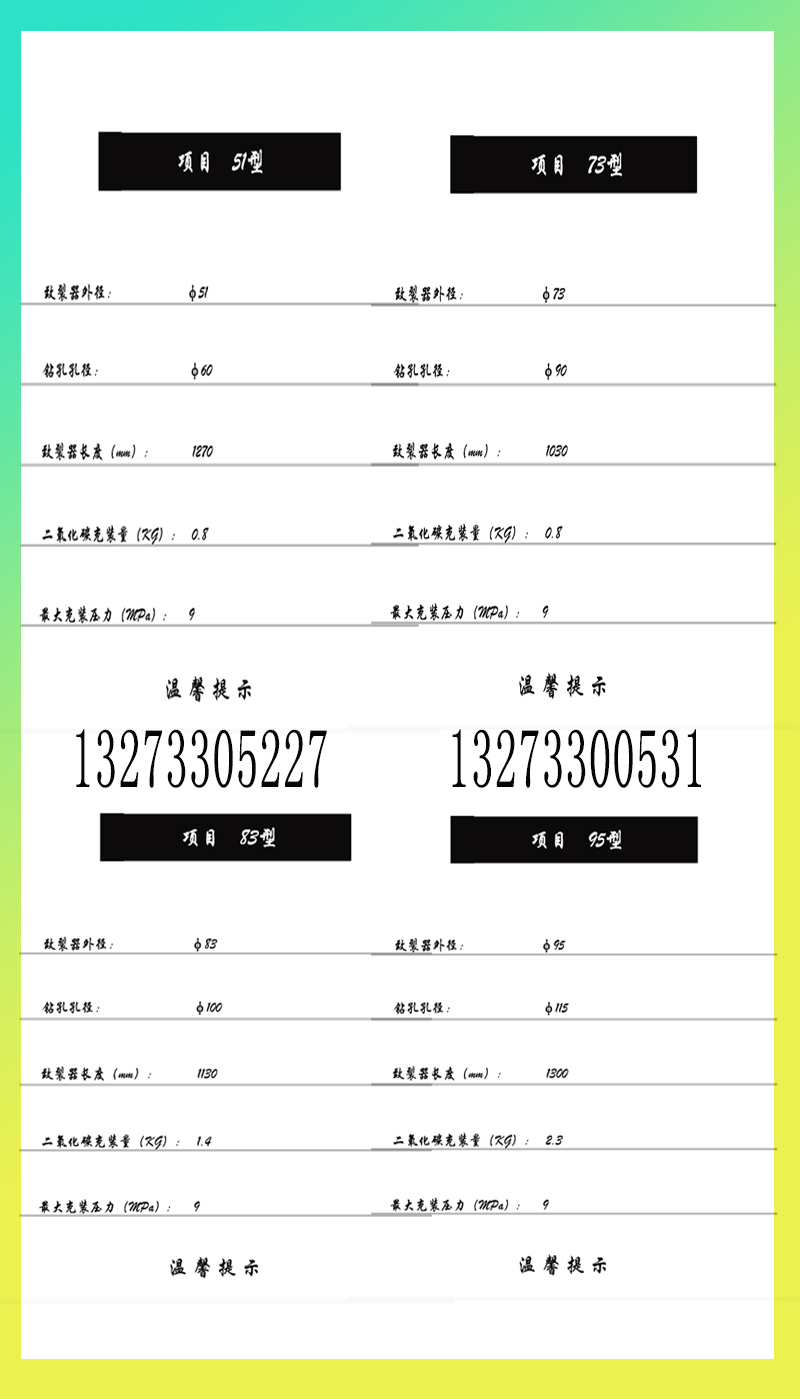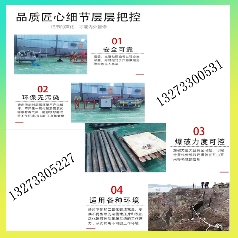 气体膨胀器二氧化碳气体膨胀开采器技术起源和发展:该项技术自二十世纪五十年代.开始被重视和开发,是为高瓦丝矿井的采煤工作面研发的。因其安全使用方便的特点很快被应用于水泥、钢铁行业。随着技术的不断发展完善,目前已经在欧美国家的采矿业、隧道工程、市政工程、水下致裂等领域进行广泛推广和应用。我国引用此技术相对滞后且保守。为了改变这种现状,目前该技术日臻完善和成熟。传统咋药退出民爆市场的时代已经来临,即将开启一个划时代的革命。