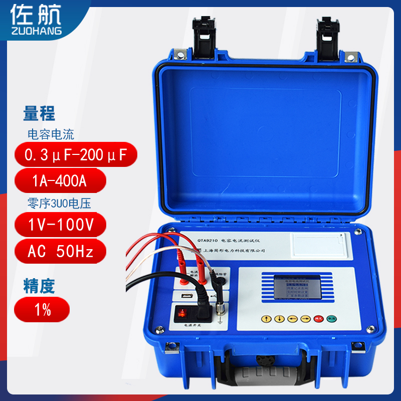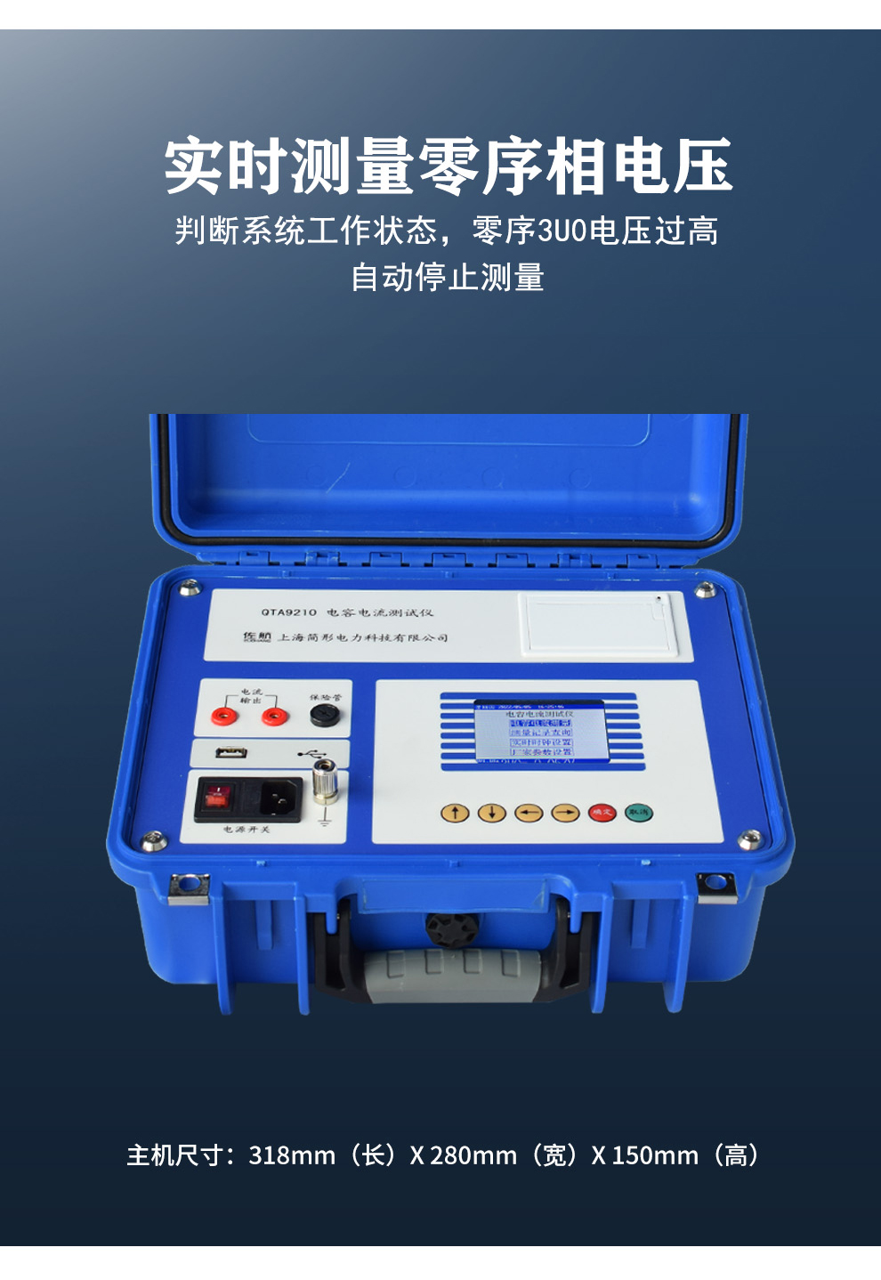 佐航QTA9210电容电流测试仪采用全新硬件结构和速度更快的ARM处理器及AD转换器,内置全新的全数字变频逆变电源,效率高、发热量小、体积小、重量轻,更加便于携带和现场测试。在任何时刻(包括测量过程中)都可准确测量零序3U0电压,从而便于用户判断系统工作状态;并且在测试过程中,如果零序3U0电压过高可自动停止测量过程。